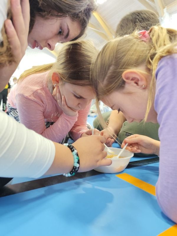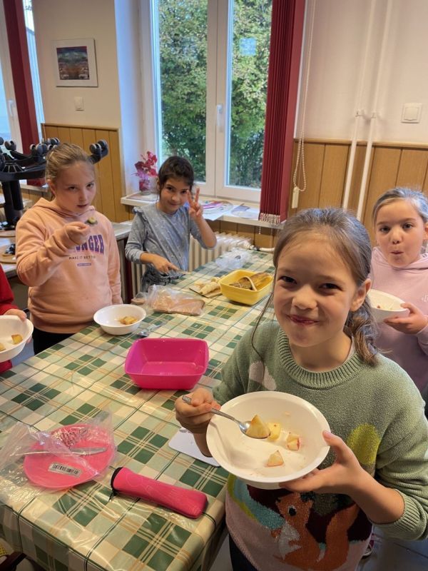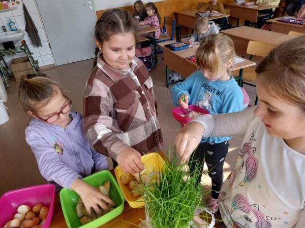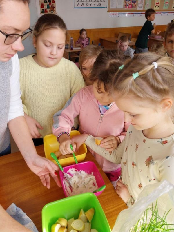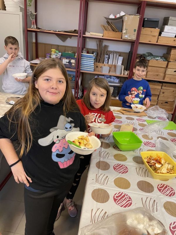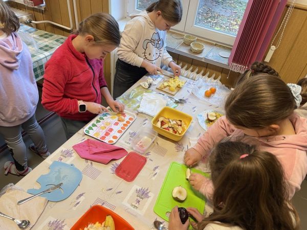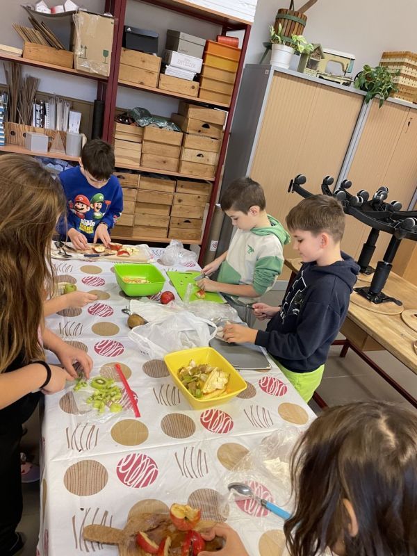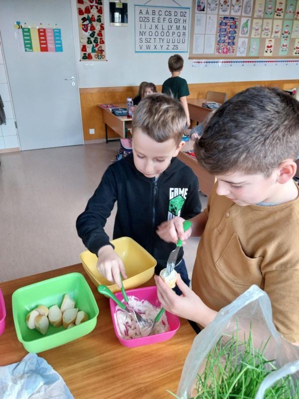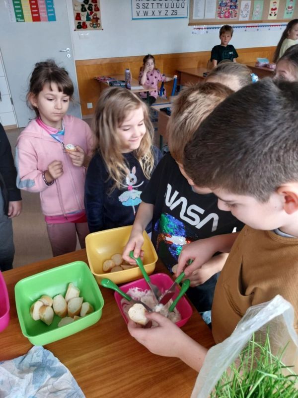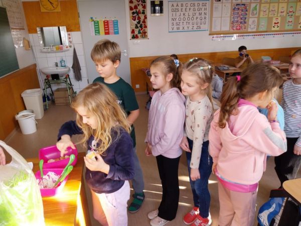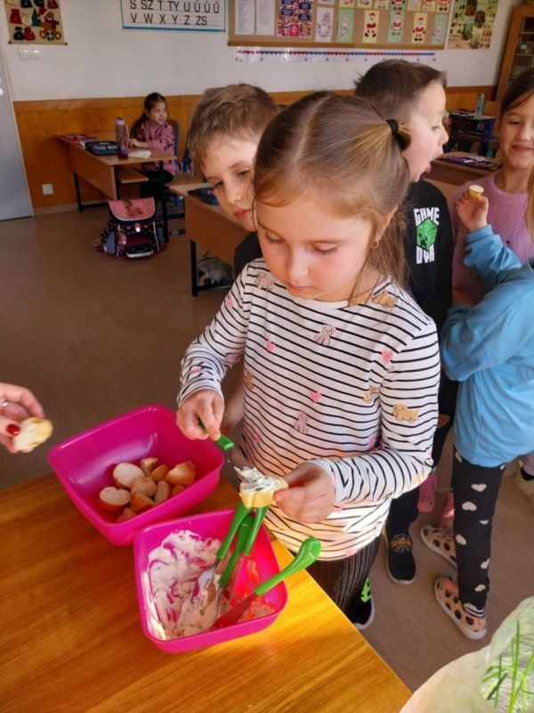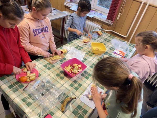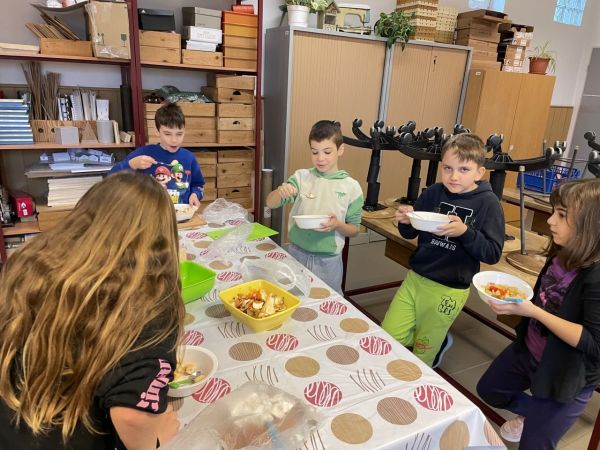 „Az egészségnevelési témahéten a harmadik osztályosokkal technika órán gyümölcssalátát készítettünk, ami igazi élménnyé vált mindannyiunk számára. A gyerekek lelkesen válogatták, mosták és darabolták a gyümölcsöket, közben pedig sokat beszélgettünk az egészséges táplálkozásról. Jó volt látni, milyen büszkék voltak a saját „alkotásukra”. A gyümölcssaláta hatalmas sikert aratott, többük mondta, hogy otthon is szeretné majd elkészíteni a családjának.” (Sümeghi Lili Anna beszámolója)